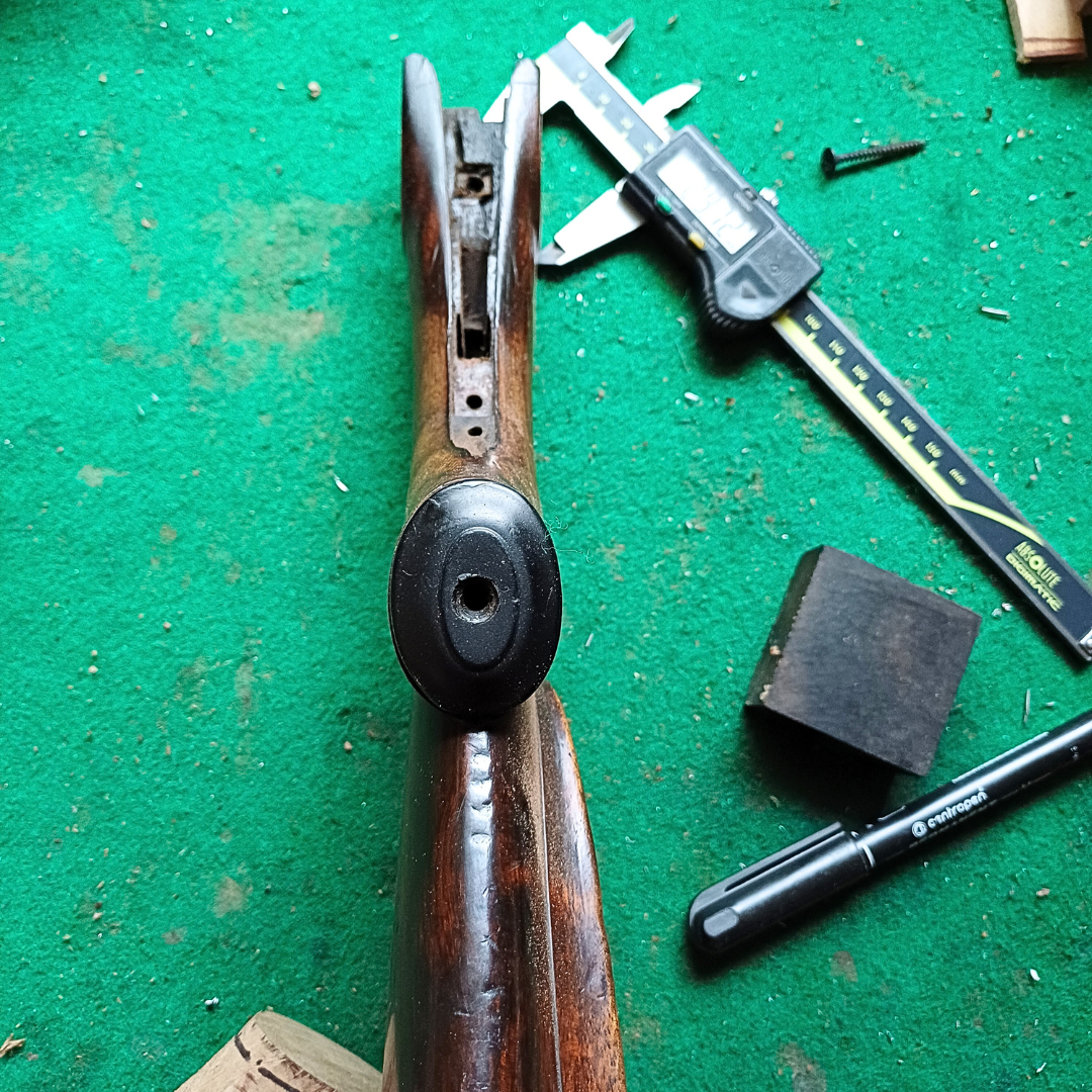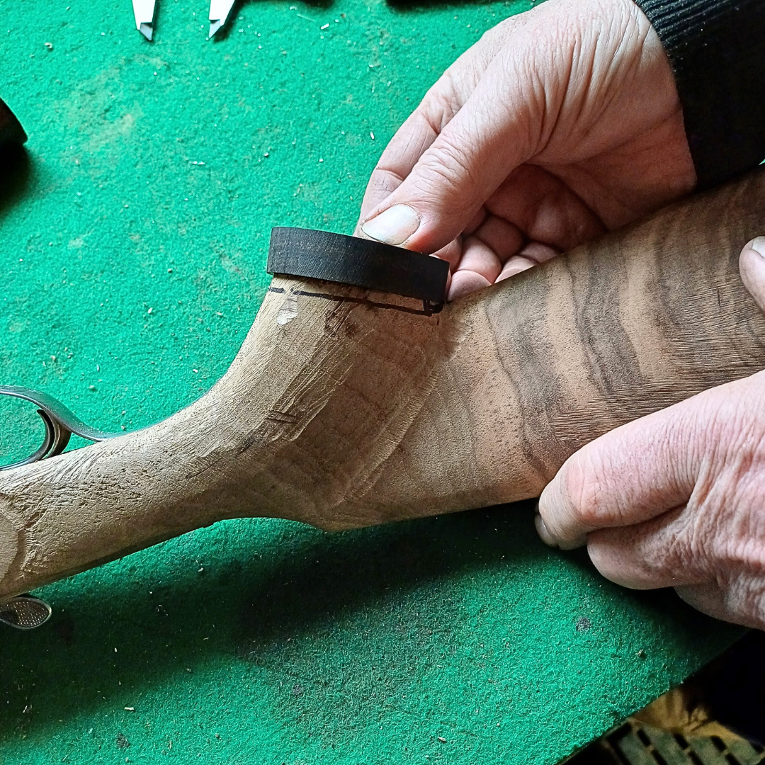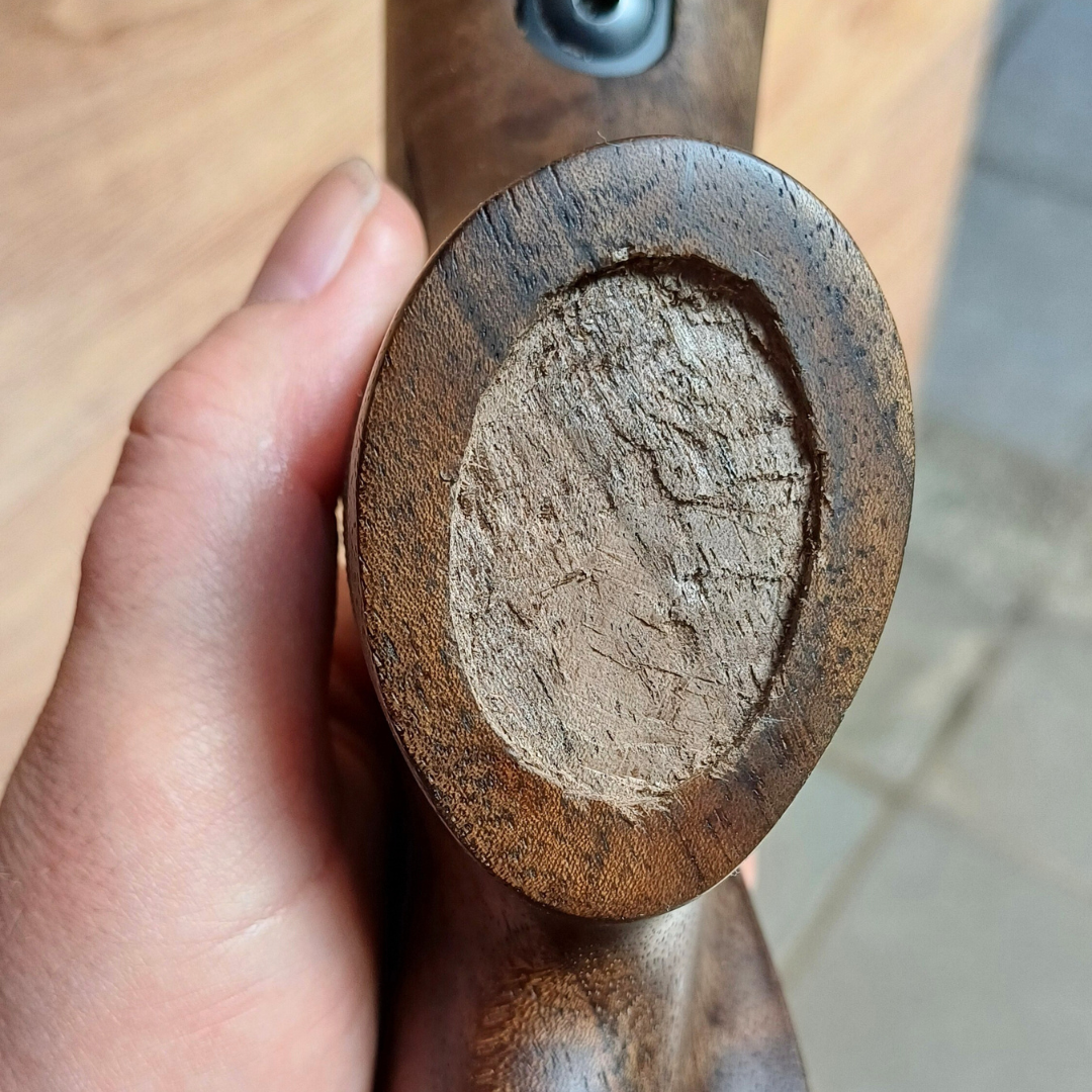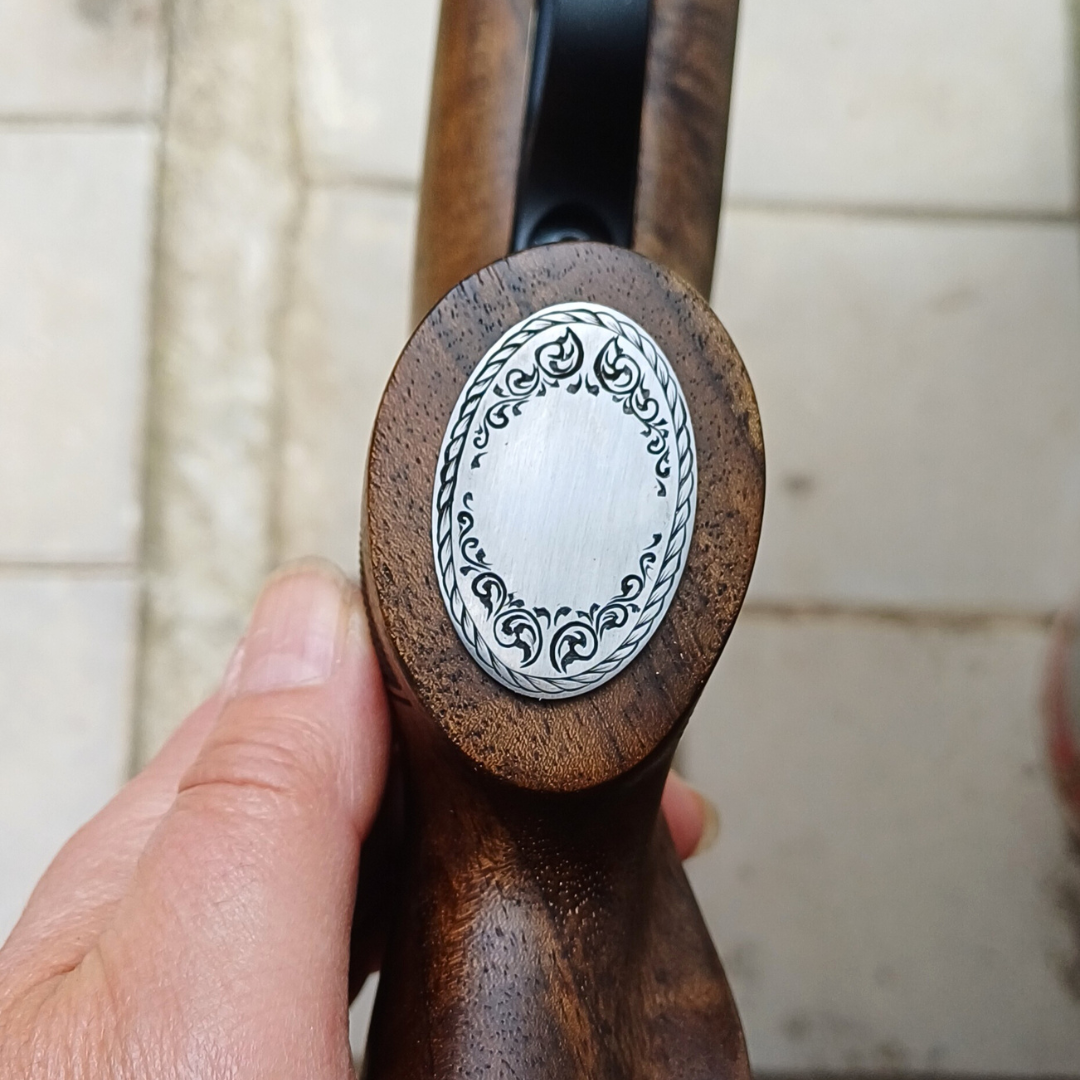 Vyvrtám, podlepím a přišroubuji na pažbu. Nechám zaschnout. Tvar i velikost pak krásně přizpůsobím medailonu. Dělám to rašplí, pilníkem, smirkem. Tím ale poškodím okolí.