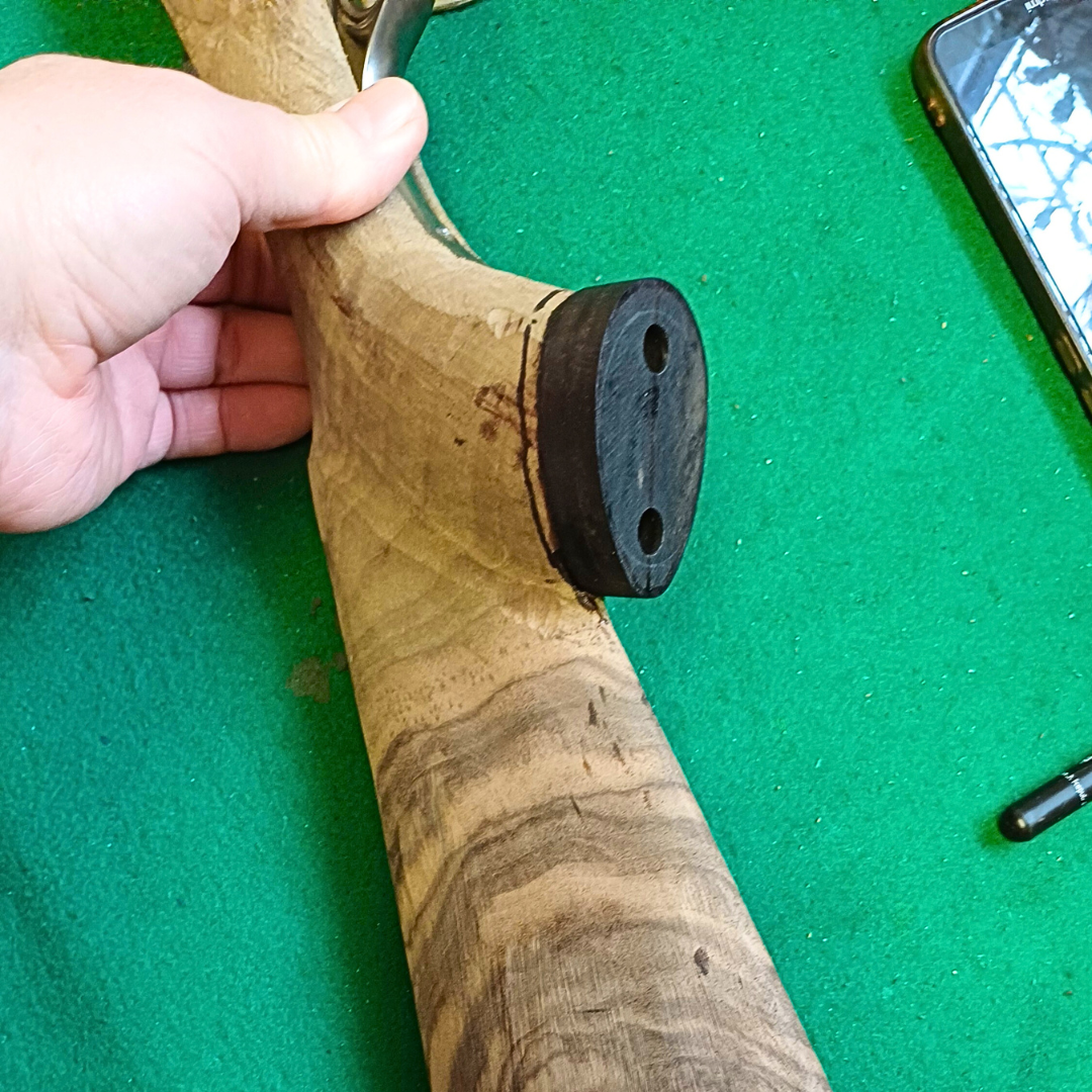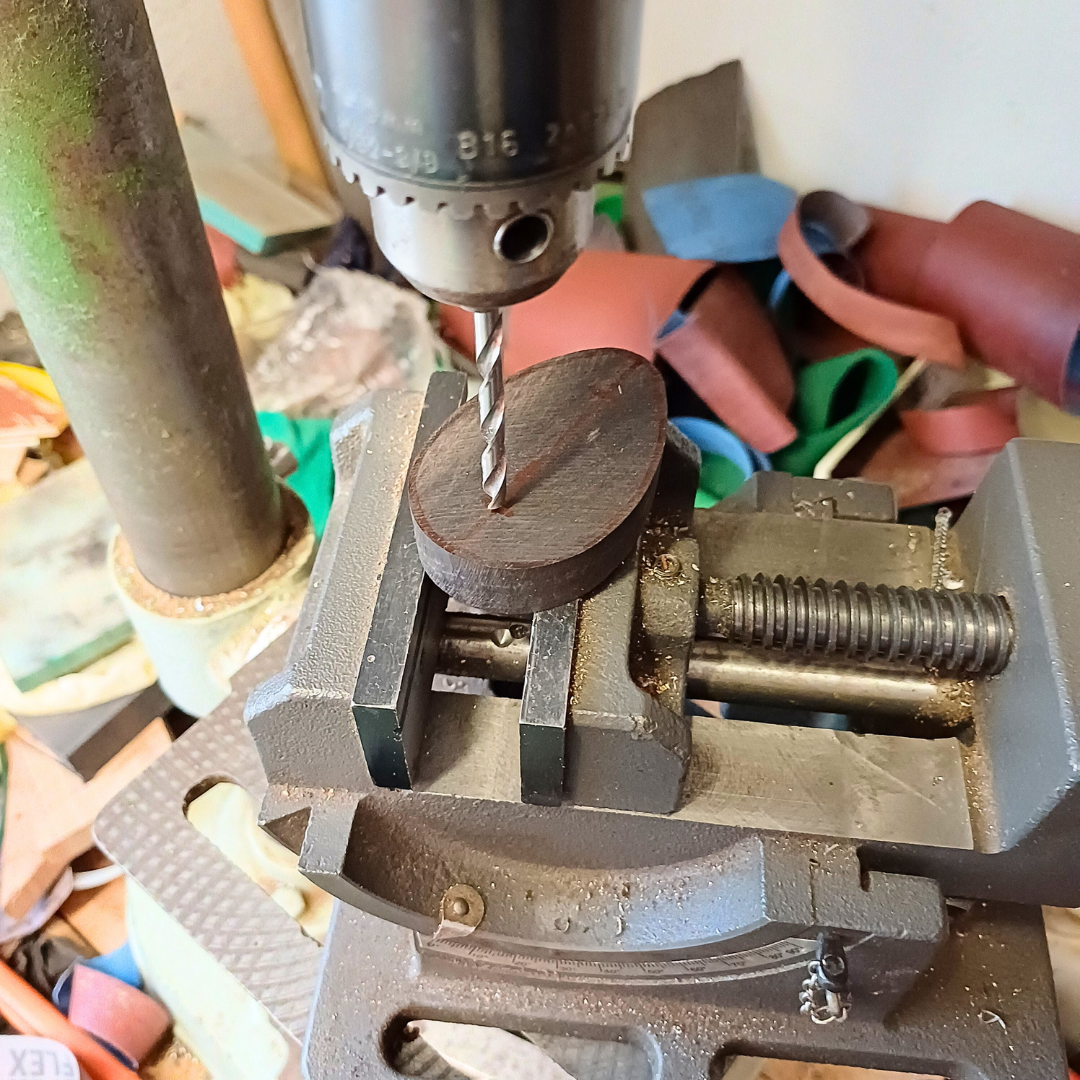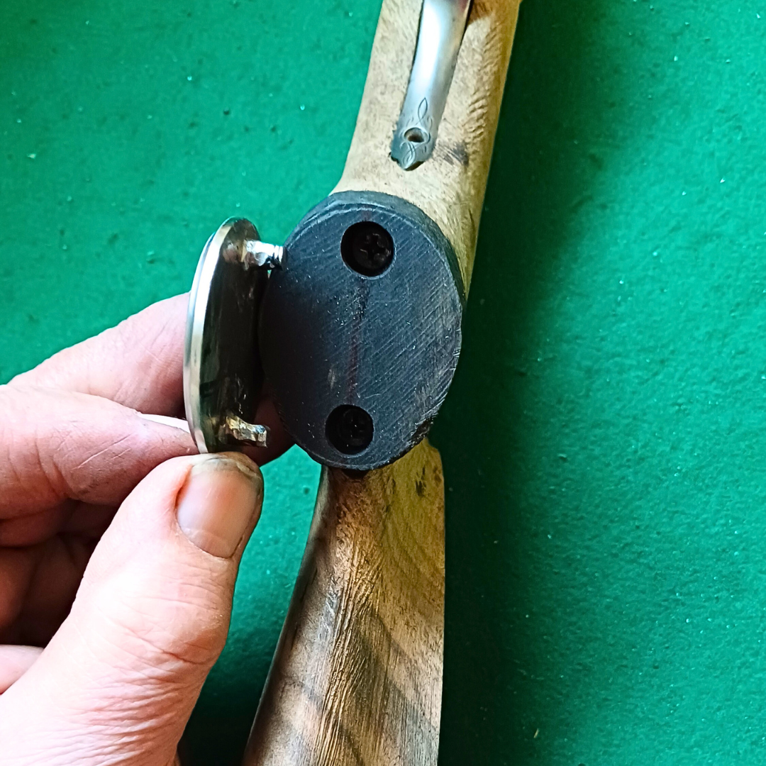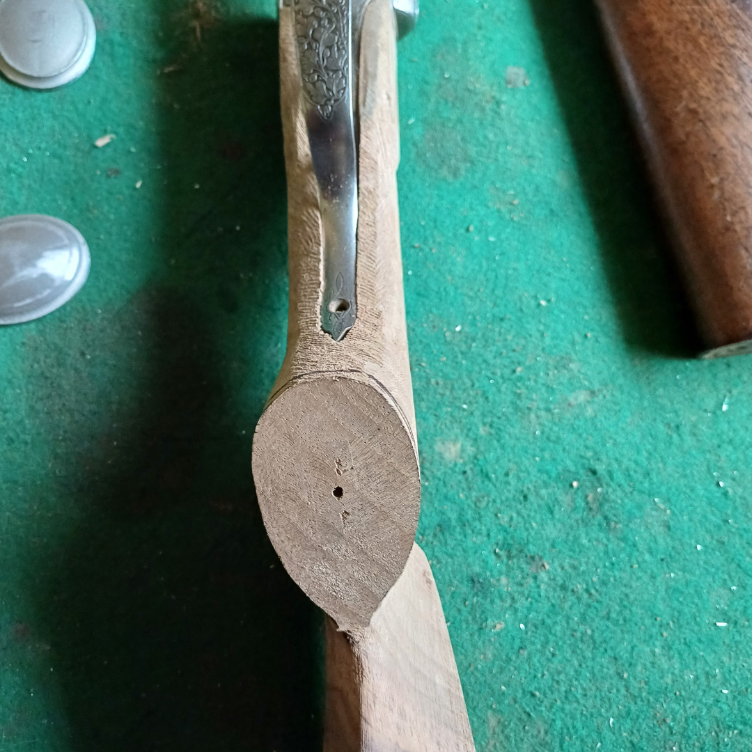 Vyvrtám, podlepím a přišroubuji na pažbu. Nechám zaschnout. Tvar i velikost pak krásně přizpůsobím medailonu. Dělám to rašplí, pilníkem, smirkem. Tím ale poškodím okolí.