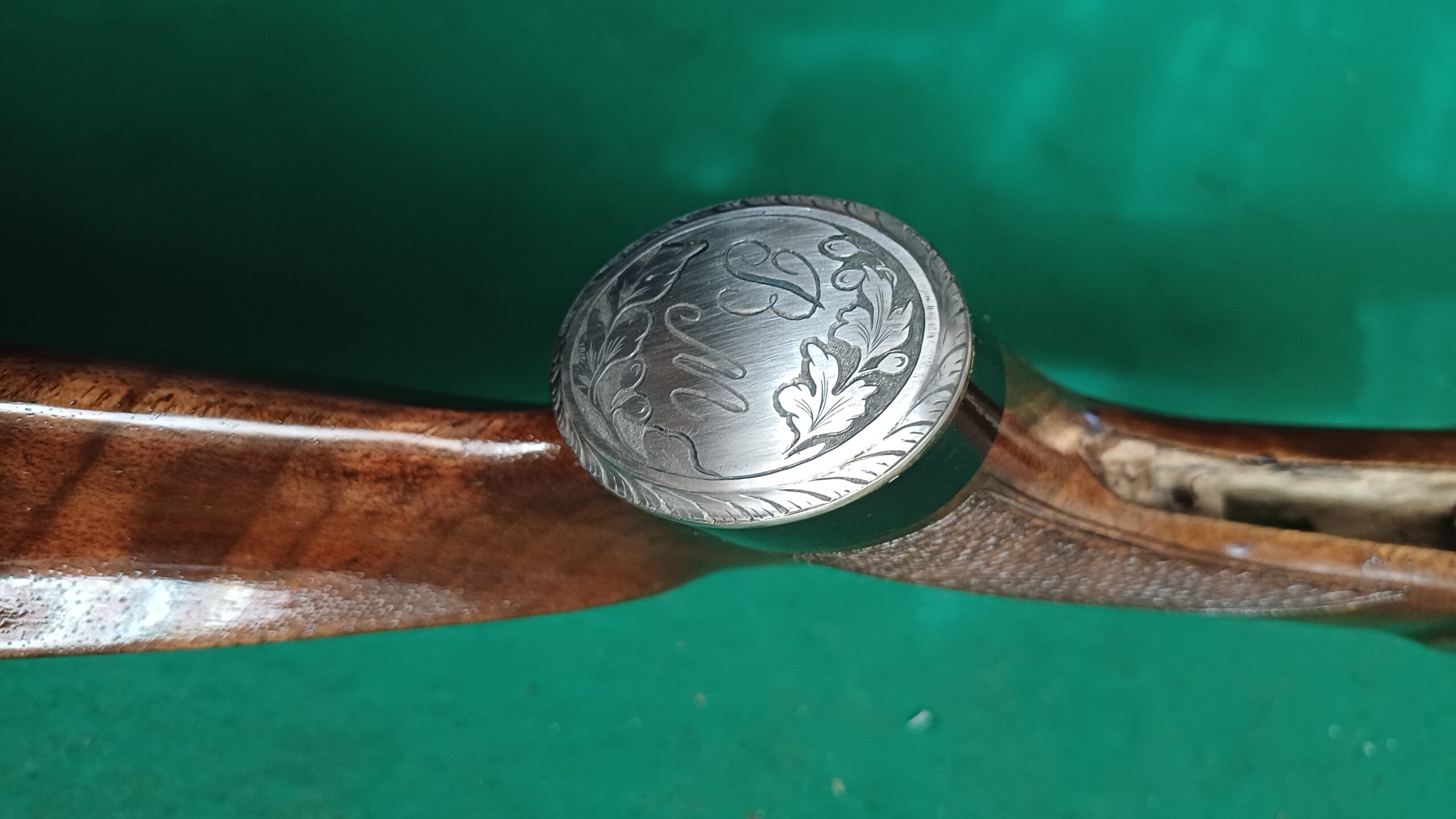 Medailon, který zadlabu do plochy dřeva. Často je to malý oválek 2,5 x 4 cm, který zapustím celou jeho tloušťkou materiálu do dřeva pažby tak, že obě plochy jsou zároveň.